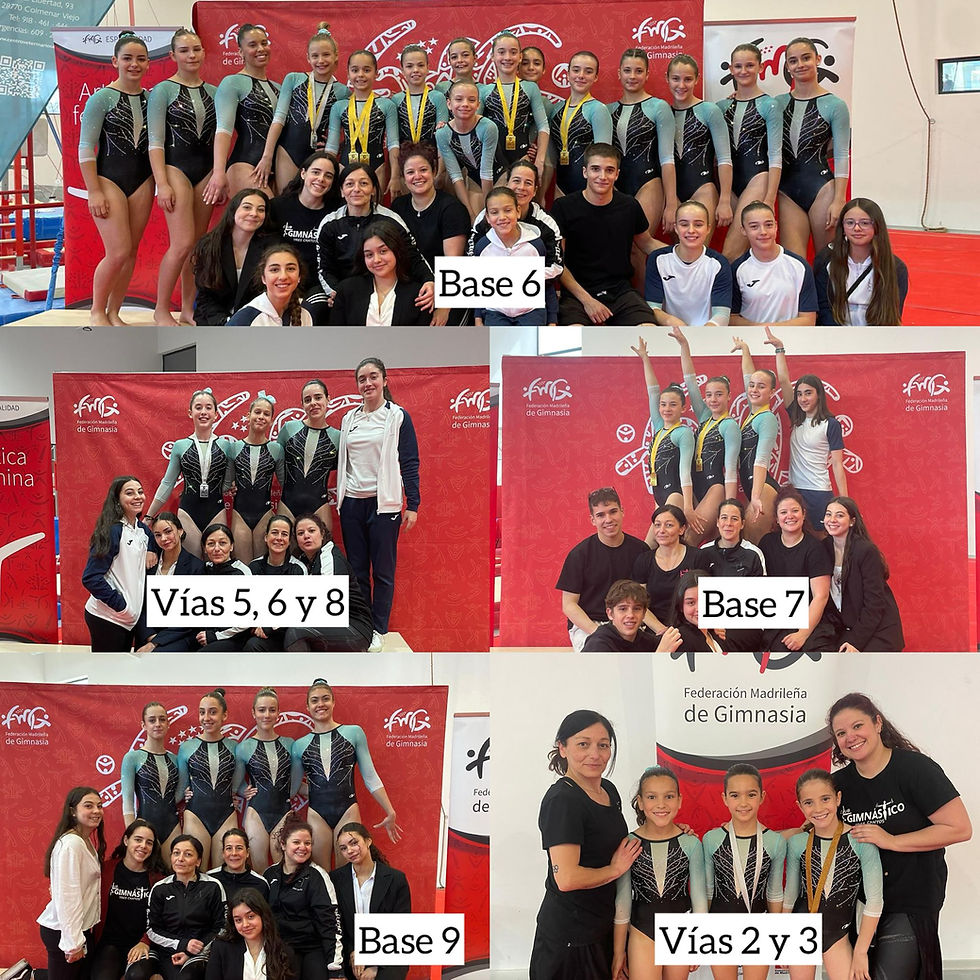 El 23-24-25 de Mayo se celebró en San Agustín de Guadalix la competición más importante a nivel autonómico: el Campeonato de Madrid Base y Autonómico Vía Olímpica de la FMG. Participamos en los niveles Base 2-7 y 9 y en Vía Olímpica 2, 3, 5, 6 y 8. Todas las gimnastas realizaron una magnífica competición, y destacamos los siguientes resultados, en las categorías Base: BASE 4: Alicia Martínez: plata en paralelas; Victoria García: plata en barra; Noa Kaluza: bronce en barra; BASE 6: Natalia Almirón: bronce en salto; María Grande: bronce en paralelas; Mía Martín: oro en salto, paralelas, suelo y la general; BASE 7: Daniela Fernández: bronce en salto; Nadia Ponce: oro en salto, plata en paralelas y la general; Paloma Barturen: oro en paralelas, suelo y la general; BASE 9: Ariadna Elena del Cura: oro en suelo. En las categorías de Vía Olímpica: VO2: Martina Fernández: oro en paralelas, suelo y la general; Carolina Arias: plata en salto y bronce en suelo; VO6: Carlota Sánchez: bronce en barra y suelo, plata en salto y la general, oro en paralelas; y VO8: Marta de Vicente: plata en suelo. ¡Enhorabuena a todas las gimnastas!