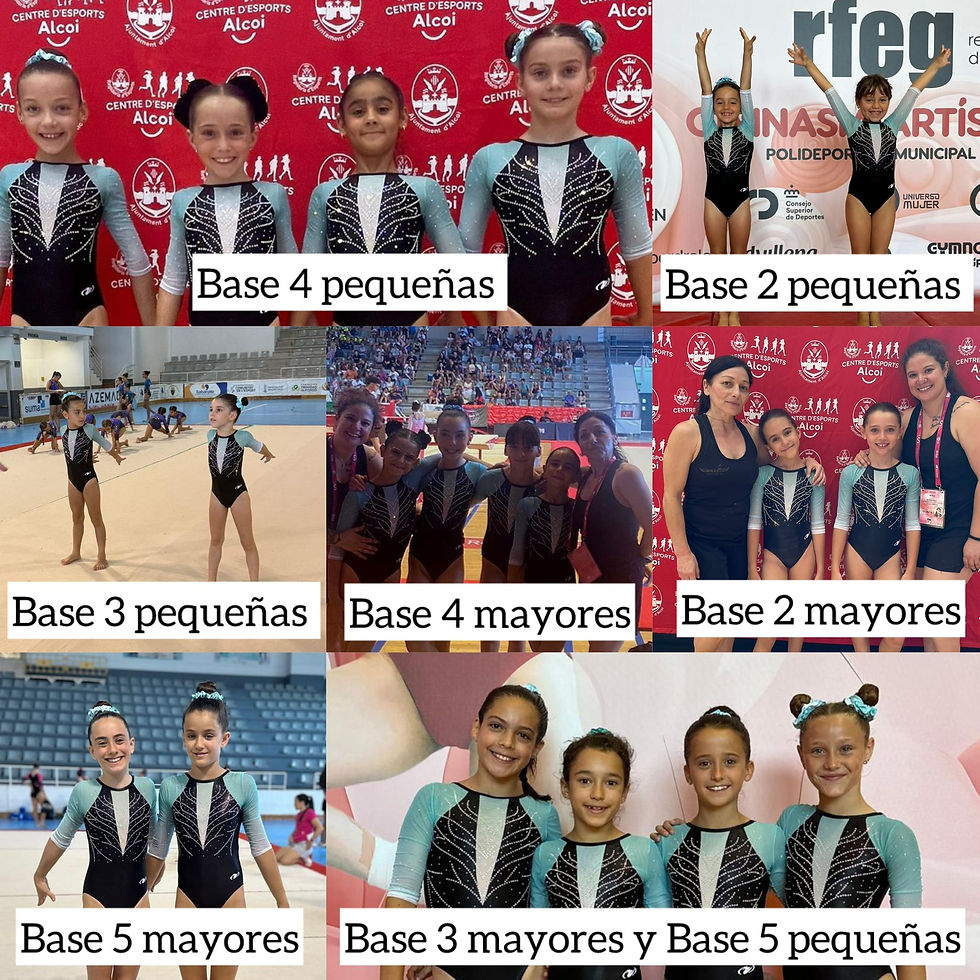 Del 1 al 5 de Julio se celebró en el Pabellón Municipal Francisco Laporta en Alcoy el Nacional Base de GAF. Tuvimos representación en los niveles de BASE 2, 3, 4, 5, 6, 7, y 9. Todas realizaron muy buena competición demostrando que todo lo trabajado durante la temporada mereció la pena. Podemos destacar los siguientes resultados: en BASE 4 2014 Anteriores: Alejandra Tamayo fue quinta en barra seguida de Abril Sofía Manzo en sexta posición; en BASE 5 2013: Lys Sanguino fue cuarta en salto; en BASE 6 2011 y anteriores: Isabel Fernández fue sexta en salto y séptima en la general, e Irina Sgura fue séptima en barra, por equipos consiguieron subirse al segundo escalón del podium como ¡SUBCAMPEONAS NACIONALES!; en BASE 6 desde 2013: Mía Martín fue sexta en la general, y ¡por equipos consiguieron el TERCER PUESTO!; en BASE 7 2011 y anteriores: Paloma Barturen fue sexta en salto; en BASE 7 desde 2012: Daniela Fernández fue séptima en barra, quinta en suelo, sexta en la general y ¡SUBCAMPEONA NACIONAL EN SALTO!, por último, en BASE 9 2008 y anteriores: María José Hernández fue novena en paralelas y Ariadna Elena del Cura fue cuarta en barra. ¡Enhorabuena a todas, la temporada que viene más y mejor!